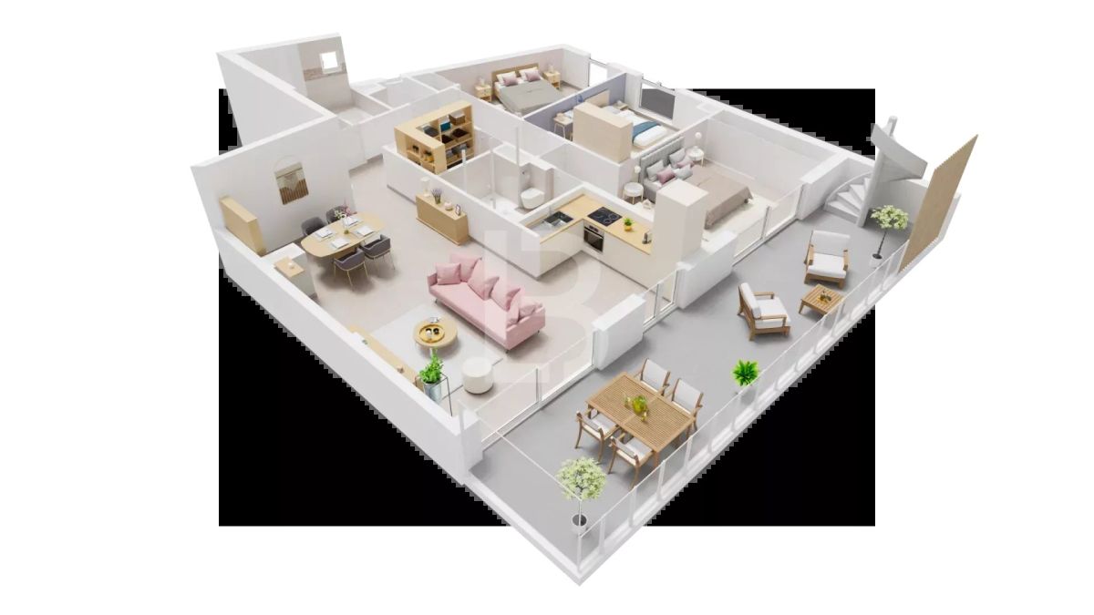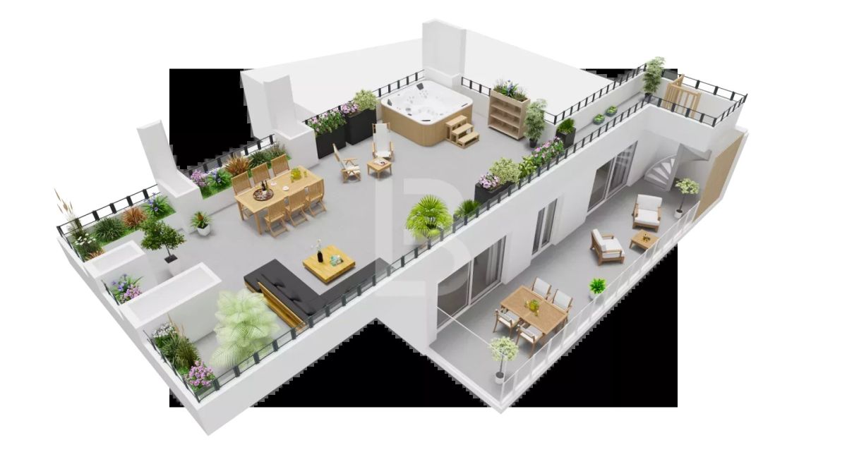 This top-floor apartment comprises an entrance hall with cupboard leading to 3 bedrooms, one of which opens onto the terrace, a bathroom with bath and double basin, a shower room with toilet, a dressing room and a guest toilet. The spacious living room with open-plan kitchen opens via two bay windows onto the 25.70 m² terrace which, via a staircase, leads to the 77 m² solarium with jacuzzi and enchanting views of the sea and mountains.