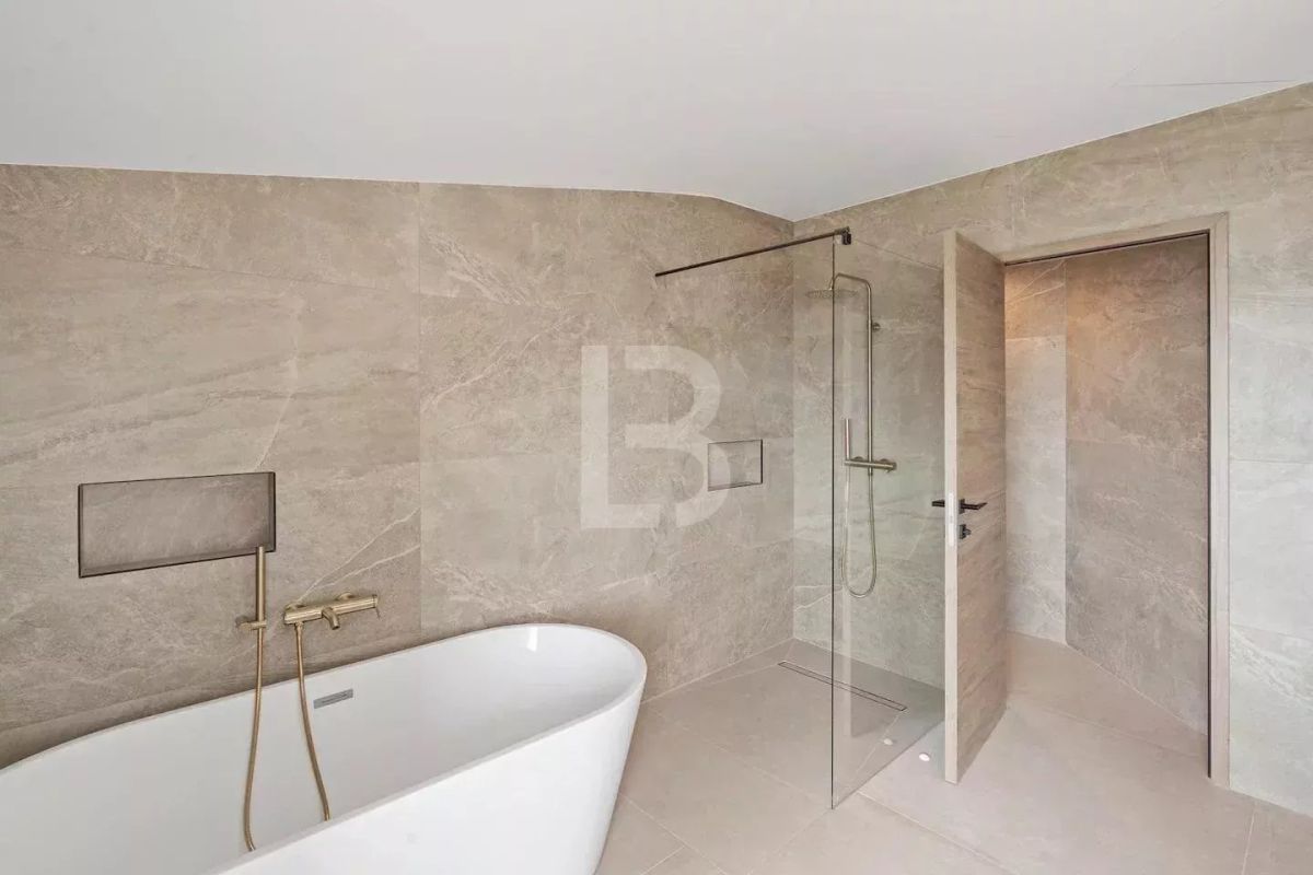 As soon as you enter, you'll be greeted by a vast, bright, modern living space, with a lounge and dining room of around 120 m², bathed in natural light and offering open sea views. The open-plan kitchen, fully equipped with top-of-the-range appliances, blends seamlessly into the living room. Utility room and guest toilet. On the same level are 2 bedrooms with fitted wardrobes and a large bathroom.