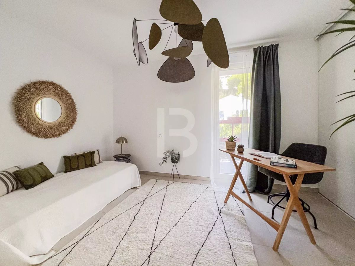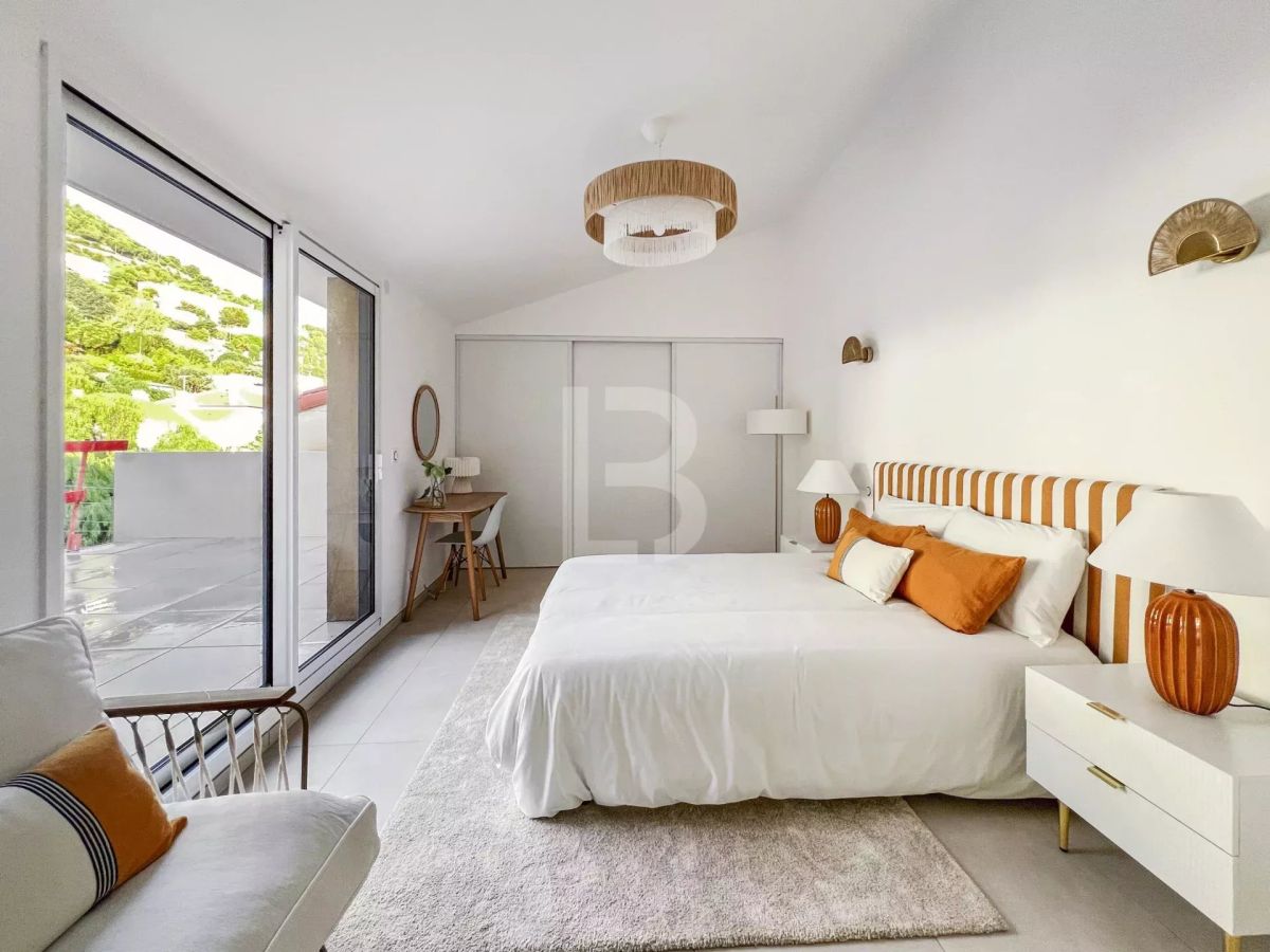 La chambre en suite avec son placard et sa salle d'eau avec WC, s'ouvre également, par une baie vitrée, sur la terrasse au sud avec vue mer.
