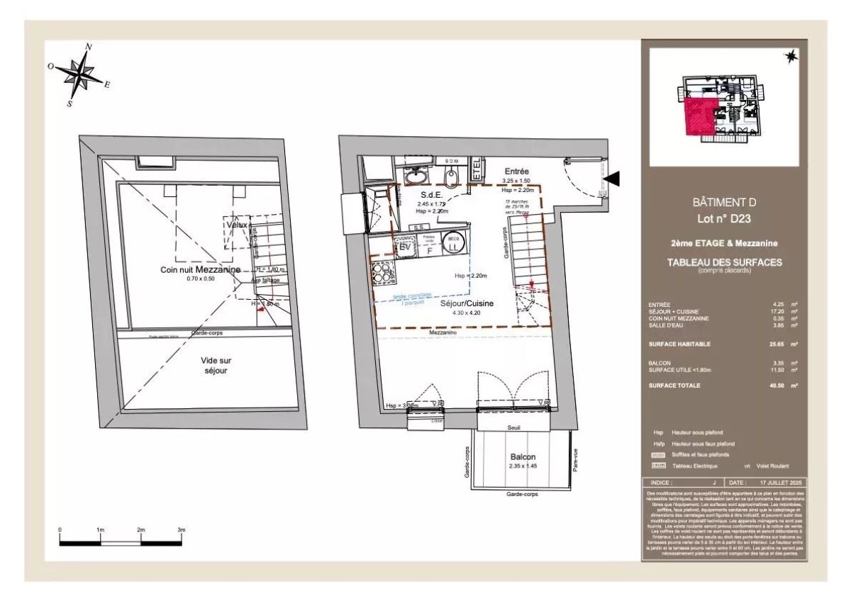 En dernier étage il se compose d'une entrée desservant un séjour au Sud s'ouvrant sur son balcon avec cuisine américaine, d'une salle d'eau avec toilettes et d'un escalier amenant à la chambre en mezzanine.
