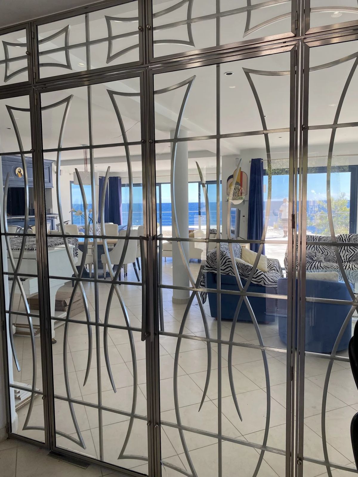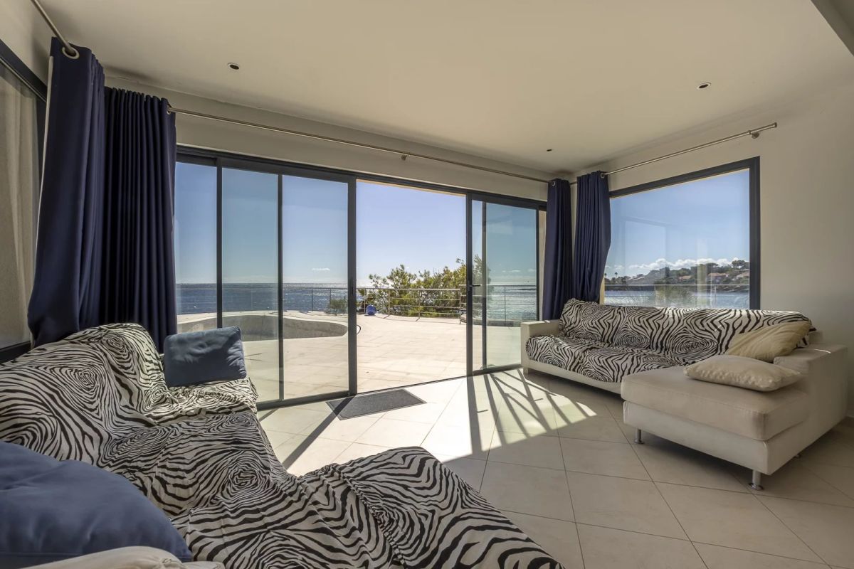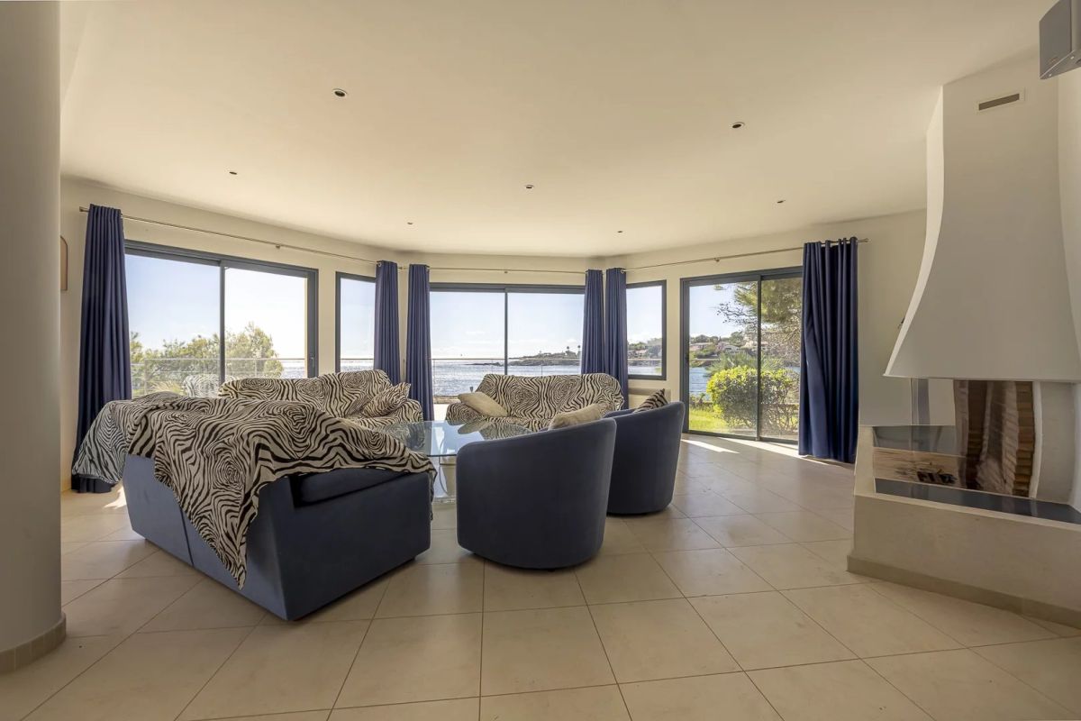 Le vaste salon, baigné de soleil grâce à ses larges baies vitrées, s’ouvre sur une immense terrasse avec piscine, permettant une continuité fluide entre intérieur et extérieur.