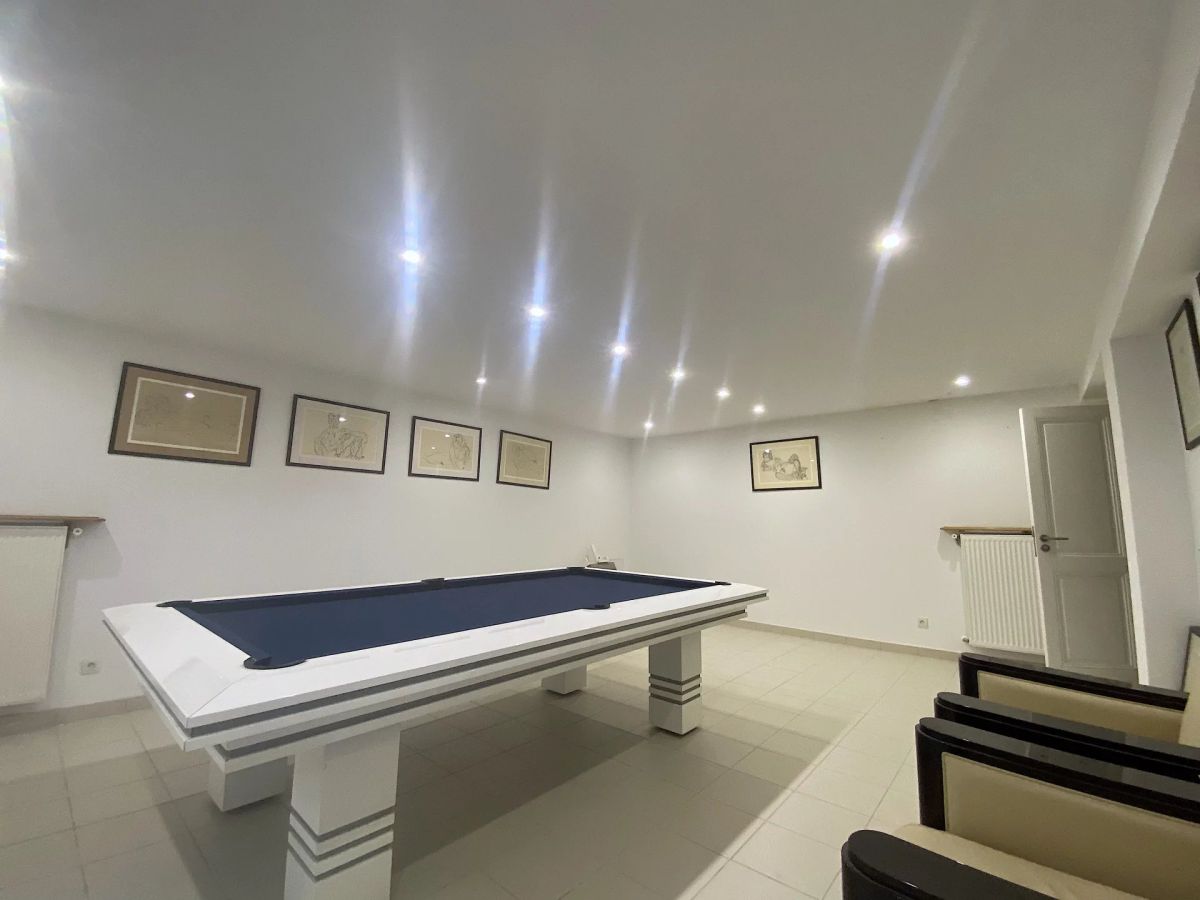 Le niveau inférieur abrite une vaste salle de billard et de multiples espaces de rangement.
